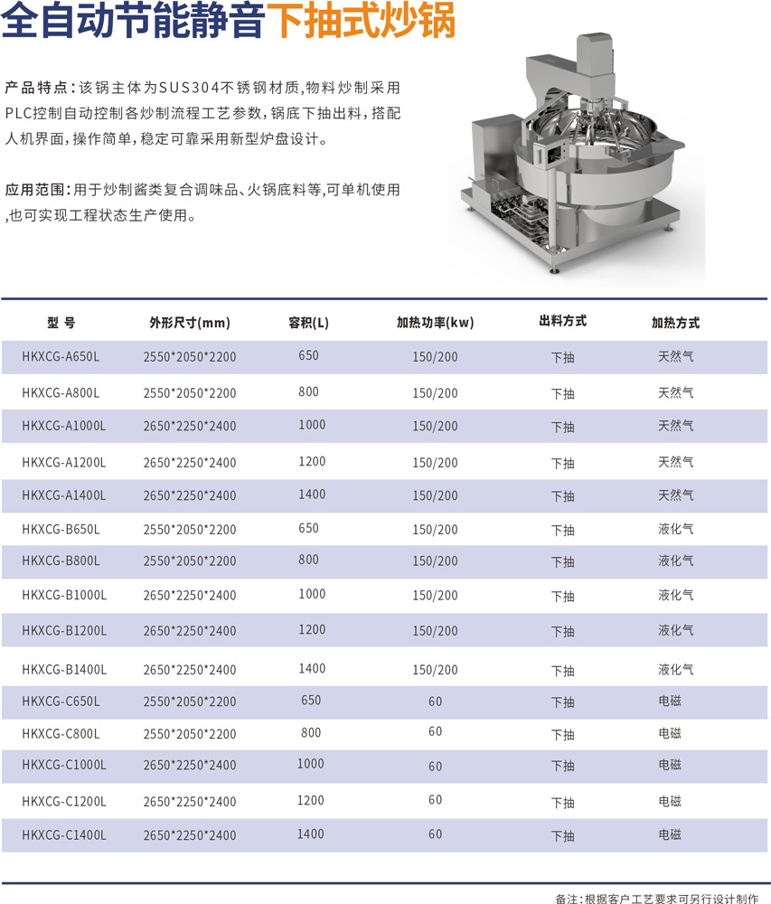 该锅主体为SUS304不锈钢材质,物料炒制采⽤PLC⾃动控制各炒制流程⼯艺参数,液压翻转出料,搭配⼈机界⾯, 操作简单,稳定可靠,采⽤新型炉盘设计。
